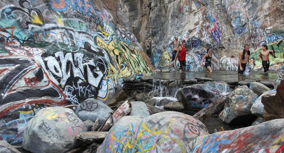 Γκράφιτι σε κάθε βράχο στο δρόμο προς τους Καταρράκτες Sapphire στο φαράγγι Cucamonga στην Καλιφόρνια