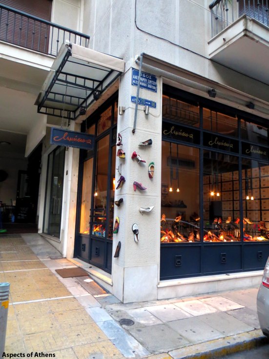 Yποδηματοποιείο Λεμήσιος στην οδό Λυκαβηττού με τα γοβάκια να κοσμούν τον γωνιακό τοίχο του Κολωνακίου