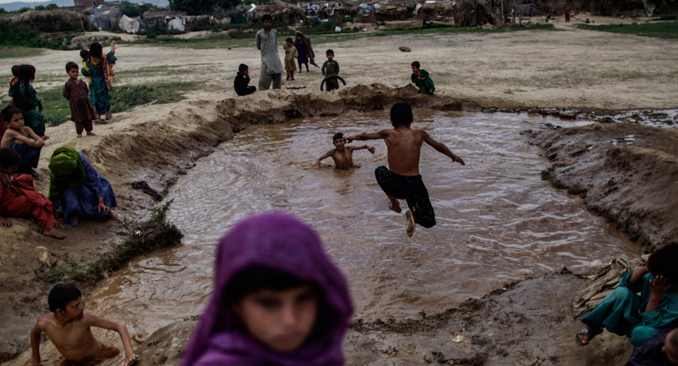 Παιδιά από το Αφγανιστάν κολυμπούν σε λίμνη από λασπόνερα σε προσφυγικό καταυλισμό στο Ισλαμαμπάντ