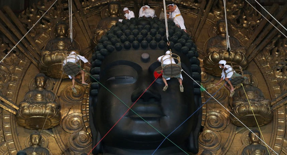 Βουδιστές μοναχοί καθαρίζουν τη σκόνη από το ύψους 15 μέτρων άγαλμα του Μεγάλου Βούδα στο Ναό Τονταίτζι στη Νάρα της Ιαπωνίας