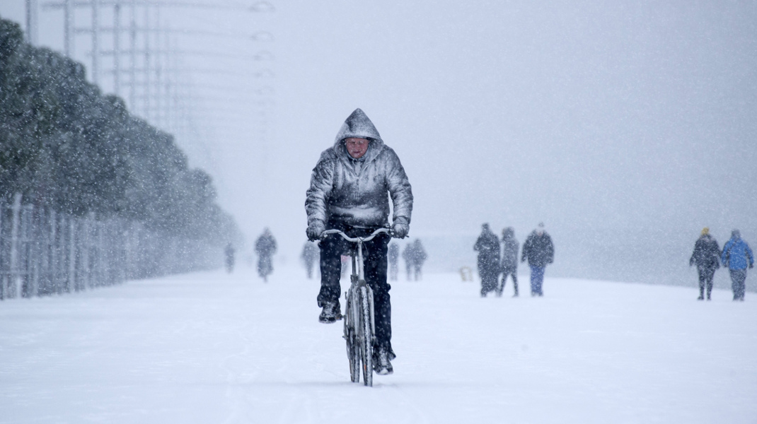 Η σφοδρή χιονόπτωση στη Θεσσαλονίκη την Τρίτη δεν πτόησε έναν ποδηλάτη