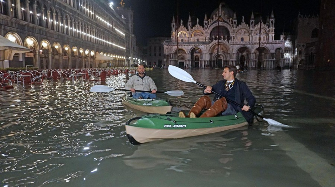 Δύο άνδρες κάνουν κανό στην πλημμυρισμένη πλατεία του Αγιου Μάρκου στη Βενετία