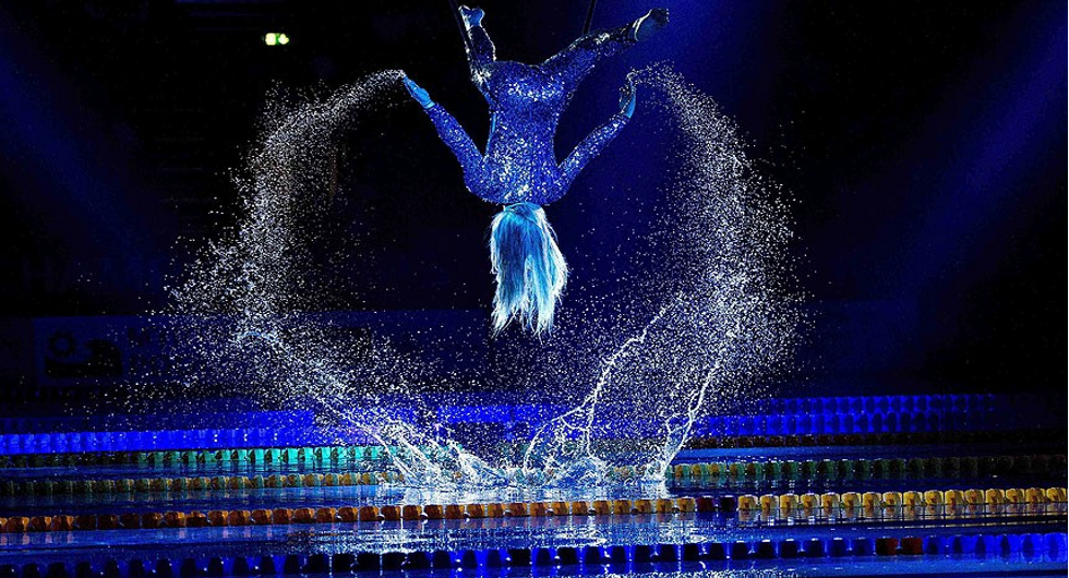 Στιγμιότυπο από το εντυπωσιακό σόου για την τελετή έναρξης του Ευρωπαϊκού Πρωταθλήματος Κολύμβησης μικρής διαδρομής της Ευρωπαϊκής Κολυμβητικής Ομάδας στο Χέρνινγκ της Δανίας
