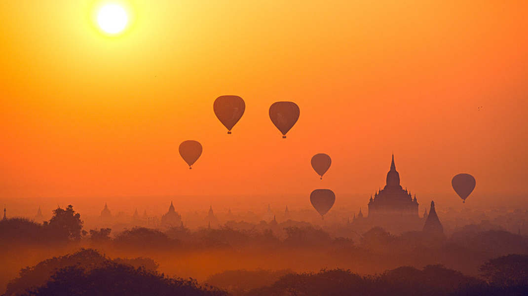 Ο ήλιος ανατέλλει στην πόλη με τους 10.000 ναούς. Μπαγκάν, Μιανμάρ