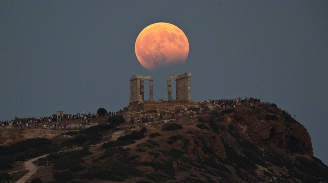 Η μαγεία της αυγουστιάτικης πανσελήνου και της μερικής έκλειψης στο ναό του Ποσειδώνα-Φωτογραφία: AP Photo/Petros Giannakouris